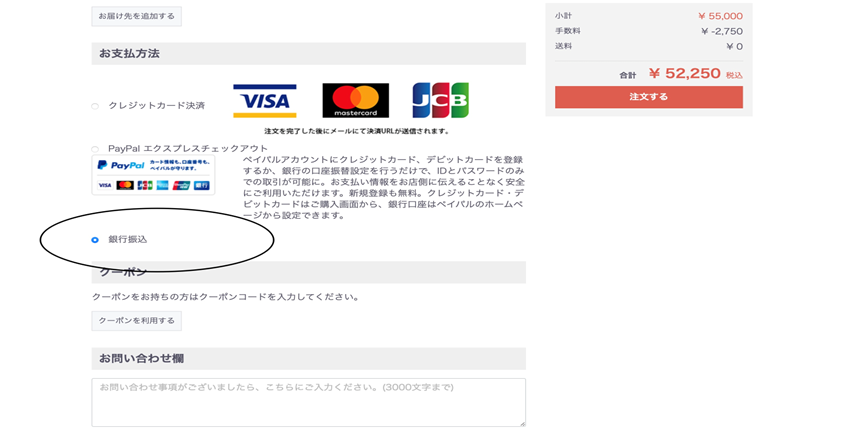 ②ご購入時 【銀行振り込み】をご選択いただきますとお支払い総額からさらに5%OFFさせていただきます。